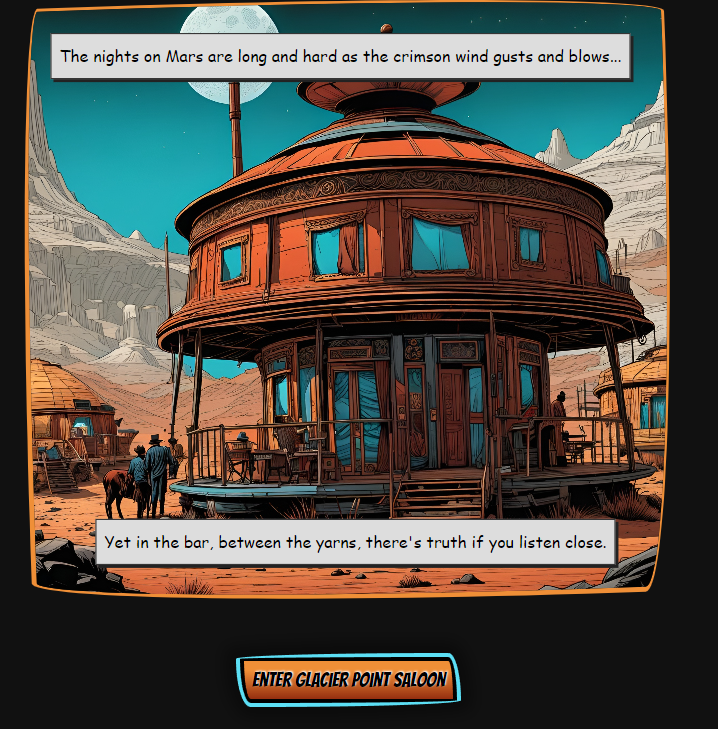 In this game, I used AI art to practice CSS, art direction and dynamic image mapping via javascript scripts which build the SVG for each shooting scene. The game is text-based and the story focuses on a mining colony on Mars, inspired by the company towns of gold rush Australia.
